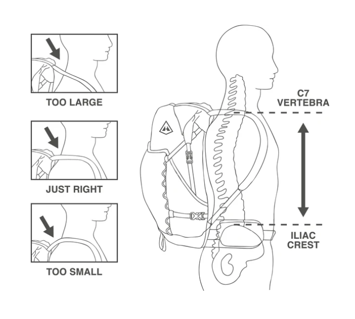 Nechte si změřit délku páteře od úrovně hřebene kosti kyčelní (horní okraj kosti na straně zad) po obratel C7 v dolní části krku. Jedná se o shora první vystouplý obratel při sklopení hlavy.